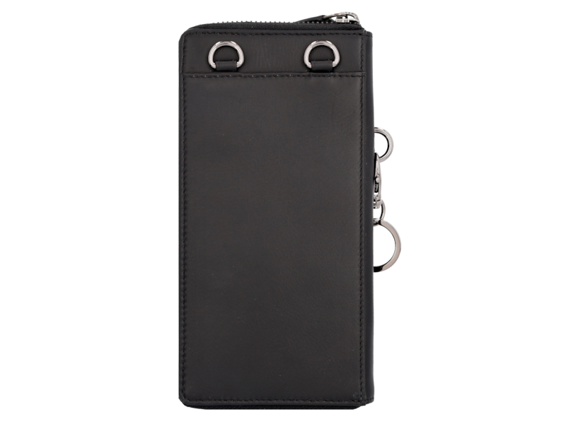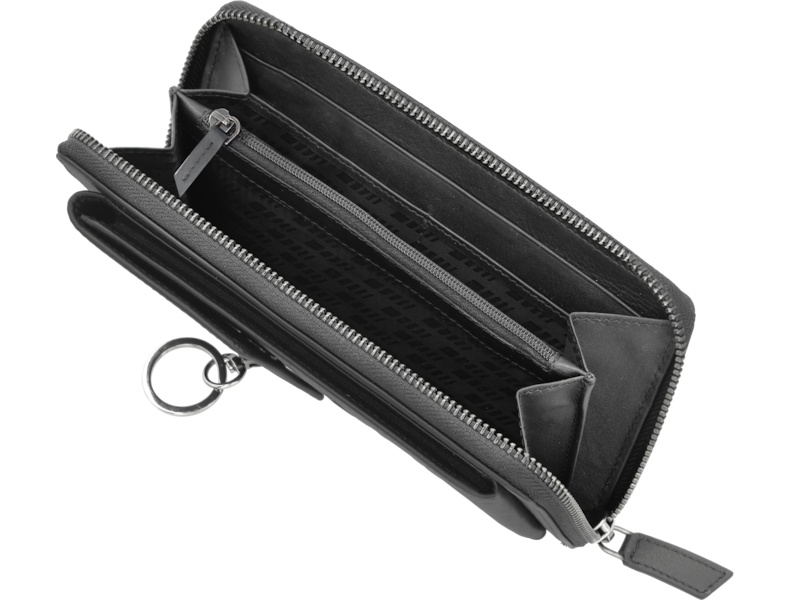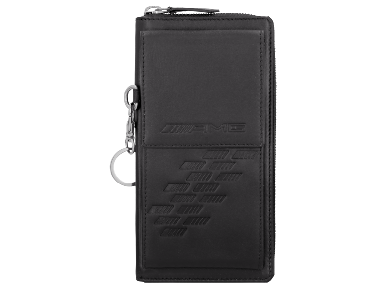 С включено ДДСПерфектната комбинация от калъф за смартфон и портфейл: калъфът за смартфон AMG с черен дизайн е изработен от висококачествена телешка кожа и впечатлява като портфейл с калъф за смартфон върху него. Вътрешните размери на калъфа за смартфон от приблизително 16,5 x 8 см са достатъчно големи, за да поберат смартфони от широк спектър производители в него. Портфейлът се закопчава с метален цип и е практически разделен отвътре. Освен отделение за монети в центъра, има и четири странични отделения за банкноти и четири слота за карти. Регулируема по дължина каишка с карабинки и допълнителен D-образен пръстен на калъфа за закрепване на карабинка с ключодържател допълват характеристиките. Външният вид е също толкова вдъхновяващ. Релефното лого на AMG и диамантеният мотив AMG на предната част на калъфа добавят много специални акценти.