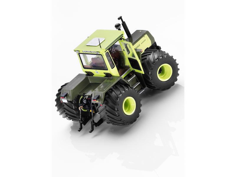 MB-trac 1300 с флотационни гуми, моделна серия 443, 1984-1987, зелен. Лят метал. Мащаб 1:32. Оригинални цветове на боята. Точно възпроизвеждане. Висококачествен печат на интериора. Отварящи се врати. Гъвкава антена на покрива, предна и задна хидравлика с регулируеми по височина горни и долни управляващи лостове, фарове и задни светлини от прозрачна пластмаса, ауспух с подвижна клапа за дъжд. Монтиран върху основа. От Weise Toys за Mercedes-Benz.
