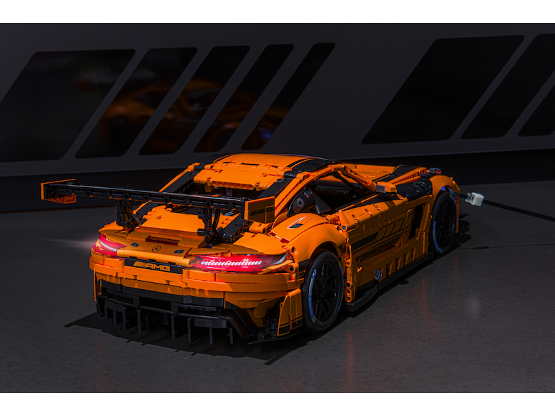 С включено ДДСA racing car, tailor-made for long-distance and GT motorsport, which has already shone at renowned events such as the Nürburgring 24 Hours or the Spa-Francorchamps 24 Hours: Experience that motorsport feeling within your own four walls with the Mercedes-AMG GT3 building block model. Consisting of 5,466 separate parts, the model impresses with its many functions, such as an 8-speed/6-speed transmission with pushbutton gear-shifting and gear indicator, a fore-and-aft adjustable steering wheel as well as a functional control rod with drive-synchronous engine operation. Independent wheel suspension, lockable doors for greater realism and a modular quick-release coupling design for bonnet, engine, intake system and centre console make the building block model perfect. LED head lamps and rear lamps ensure the appropriate lighting. The model car is delivered in the original CaDA Masters manufacturer packaging and is therefore ideal as a gift for passionate motorsport fans.