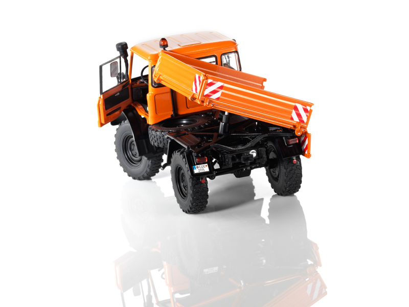 Unimog U406, U84/900, 1971-1989, оранжев. Лят метал. Мащаб 1:32. Изцяло стоманена кабина, завършена в автентични цветове на боята. Точно възпроизвеждане с висококачествен, печатан интериор. Вратите могат да се отварят. Платформата може да се накланя надясно. Свалящи се странични страни. Моделът е монтиран върху основа. От Weise Toys за Mercedes-Benz.